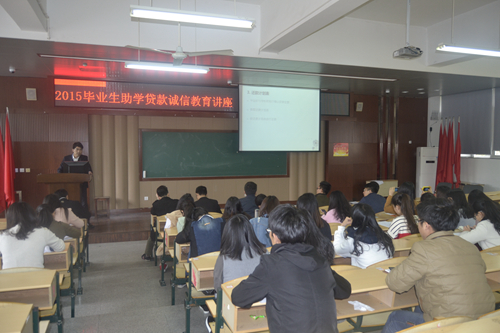 4月8日下午,由学生处组织的2015届毕业生助学贷款诚信教育讲座在善学楼101多媒体教室举行。工商银行茶山支行的助贷经理卢松和,学生处负责助学贷款工作的老师,以及2015届在校期间办理过国家助学贷款的毕业生参加了此次活动。活动由学生处学生管理科科长赵生玉主持。