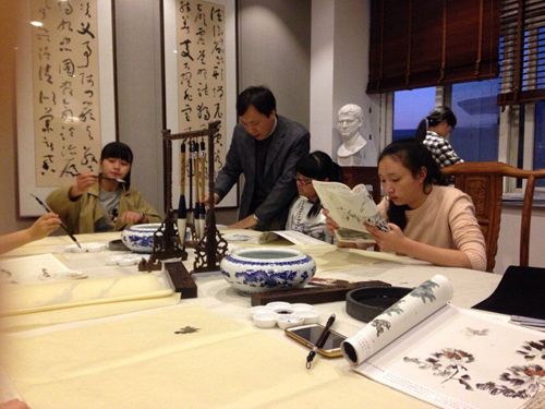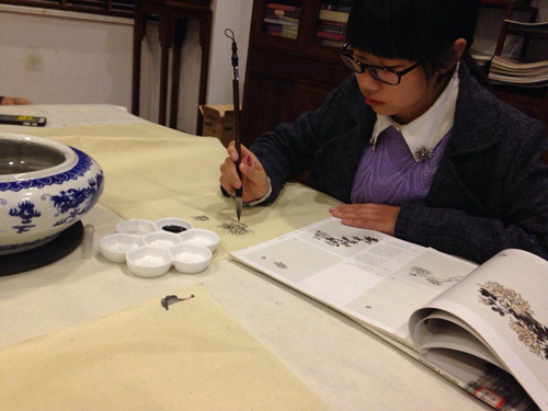 4月14日晚,国画社作为人文传播系本学期新晋特色社团之一,在明德楼三楼书画室开展第6次社团活动。指导老师沈潜先是展示一系列水墨画作品,随后在社团成员的实践讨论中从纸、笔和颜料三方面的特殊性归纳水墨画特有的绘画效果。社团学生导师杨丽丽说,沈老师这种探索式学习中国画的方式,成员都非常喜欢,因为部分社团成员是文秘、商英专业的,虽对国画有浓厚的兴趣却从未近距离接触过,在书画室亲自动手画画更是从没有过。这种方式使同学们第一次感到中国画带来的传统而又不乏活力的艺术效果。