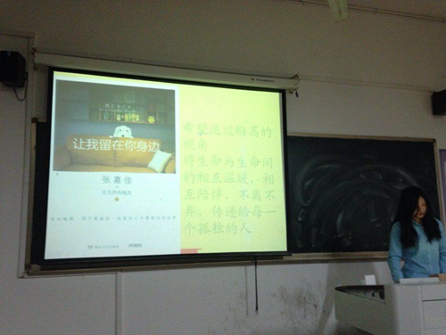 在社团活动中,有同学准备了精美的PPT课件,分享了阅读的心得;有同学带来了实体的书籍,富有感情的朗读娓娓道来地解释,让人聚精会神;还有同学独特新颖的讲述了她喜爱的故事中的角色,声情并茂。三十几位同学,阅读的主题内容不同、展示风格不同、设计形式不同,带来了多种思想和文化的碰撞。
