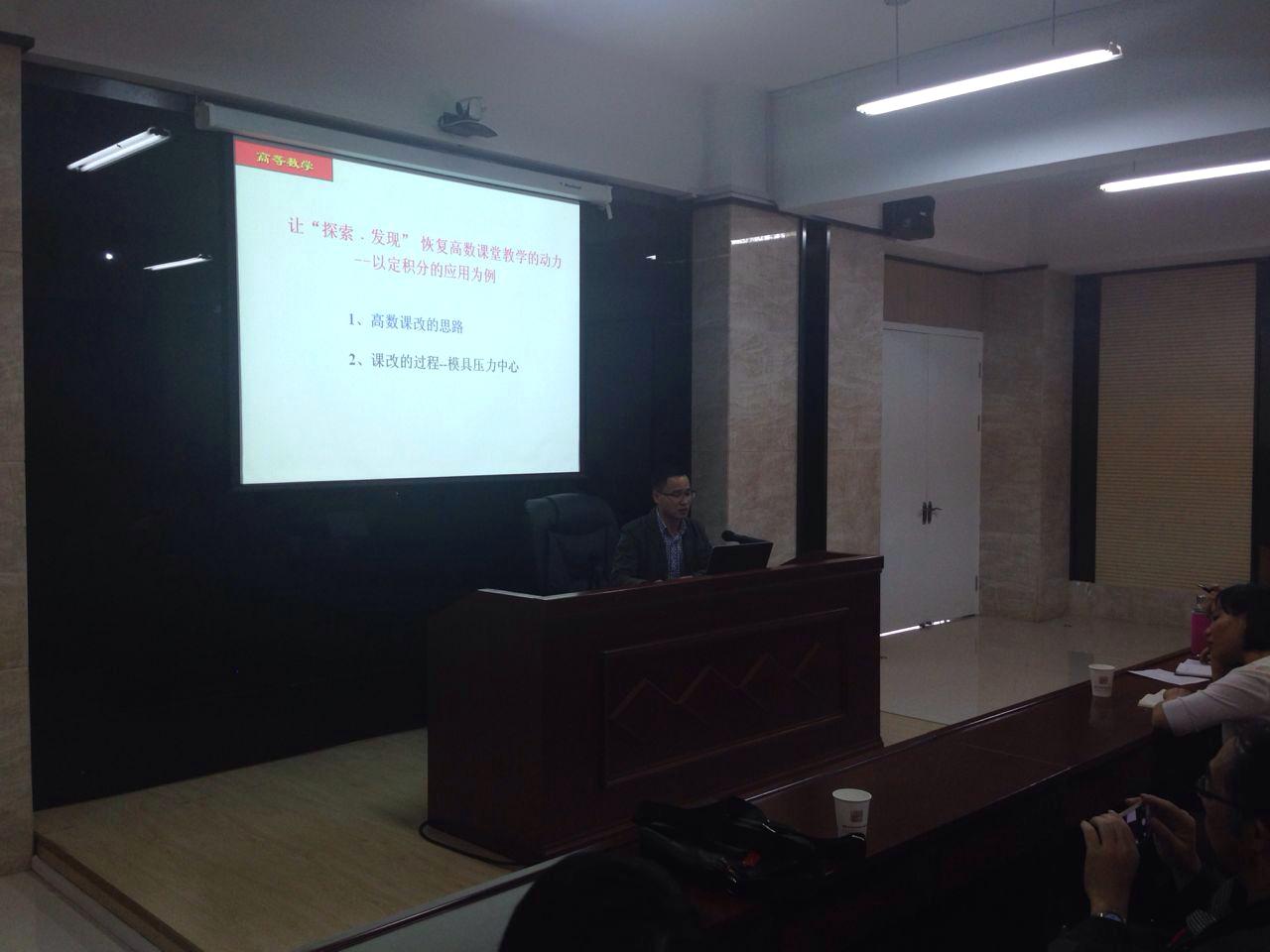 4月22日下午2点讲座如期在研发楼611进行,教务处领导及各系(部)教师到会。林斌老师分析了数学课堂教学面临的困境,提出改革的思路——问题驱动模式,并以定积分在模具压力中心上的应用为例详细介绍了应用高等数学课改的过程。
