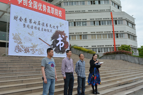 财会系以“世界读书日”为契机,打造“多读书,读好书,会读书”为宗旨的校园文化品牌活动,于4月23日下午15:00,在图书馆门前举办了“财会系第七届读书文化节暨阅读传递启动仪式”。学院党委委员、宣传统战部部长蔡后界、学生处处长、团委书记叶吉波和财会系党总支副书记吴冰老师出席了活动。活动现场由财会系学工办主任马德龙主持。