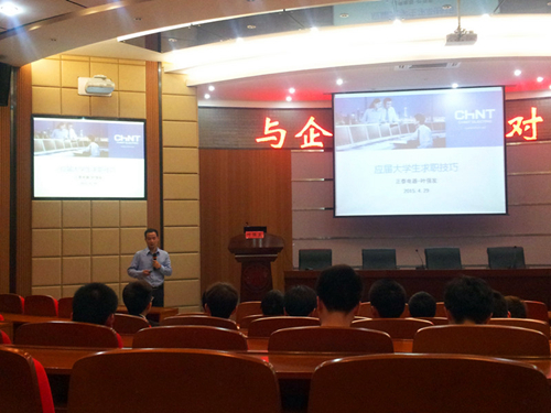 为让在校生近距离对话职场人物。4月29日晚上,“知名企业HR面对面”(第二场)在正德楼罗山厅举行。本期特邀浙江正泰电器股份有限公司人事管理副经理叶强发担任主讲嘉宾。来自电气系、机械系、信息系、建工系的100多名同学参加。