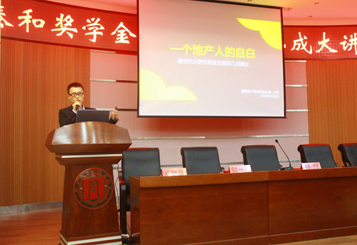 最后,泰和房产营销有限公司总裁林育作了《一个地产人的自白》的主题讲座,他以自身经历和同学们分享了“乐观、自省、坚持”六个字,激励学生以乐观的心态、自省的态度、坚持不懈的作风走好大学生活的每一步。