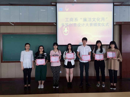 5月18日由工商系团工委宣传部举办的以“廉洁文化”为主题的书签创意设计大赛正式拉开序幕,于5月31日结束并在善学楼201举行颁奖仪式。活动面向我系全体学生,以廉洁文化作品创作、征集活动为载体,组织动员学生力量用文化作品形式反映广大学生对廉洁、廉政、廉明的理解,引导学生追求积极健康的文化时尚,树立“敬廉崇洁、诚实守信”的思想意识,形成“以廉为荣、以贪为耻”的校园风气。