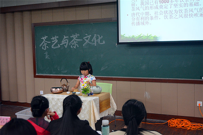 讲座由“82年龙井”的民间故事开始,故事将现场同学带入茶的世界,让同学们明白茶文化与中国传统文化之间紧密的联系。陈老师从中国茶简史、中国茶分类、饮茶与健康、科学饮茶等四个方面进行讲述。在讲座过程中,陈老师爱女亲自为同学们表演茶艺并沏茶。讲座间同学们与老师积极互动,气氛热烈。
