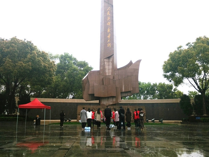 伴随绵绵细雨,学生带着花圈、鲜花徒步抵达陵园。在陵园解说员的指导下,学生怀着沉重的心情踏入烈士陵园。在烈士纪念碑前,通过奏唱国歌、肃立默哀、集体宣誓、鞠躬、献花圈等行动来缅怀革命先烈。解说员生动地讲解,让学生深刻地体会到他们的英雄事迹和为了人民解放事业不怕牺牲的气概。仪式结束后,学生一同参观了烈士陵园,给烈士献花并打扫了陵园的各个角落。
