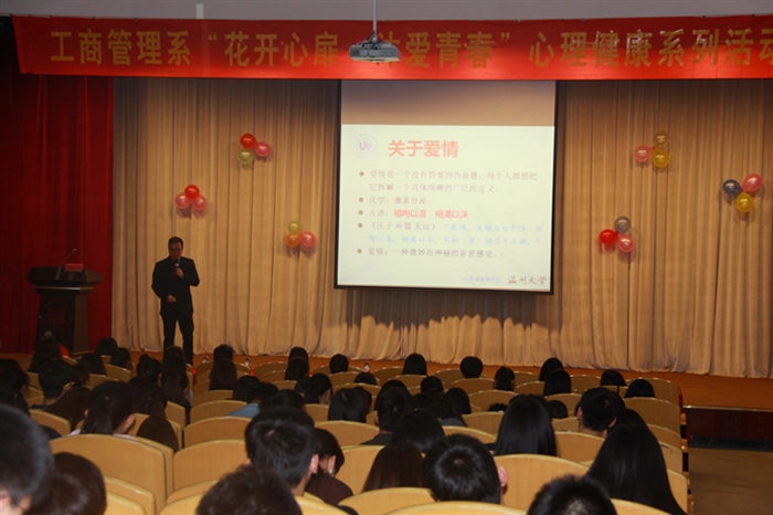 为加强学生的心理素质,引导学生树立积极健康的恋爱观。4月11日晚上,工商系在树人堂举行了以“守候花样年华”为主题的心理健康讲座。此次讲座邀请到温州大学心理学副教授、温州大学心理健康教研室主任、国家二级心理咨询师廖传景教授担任主讲人。