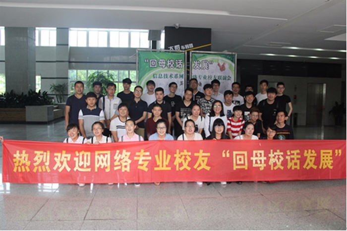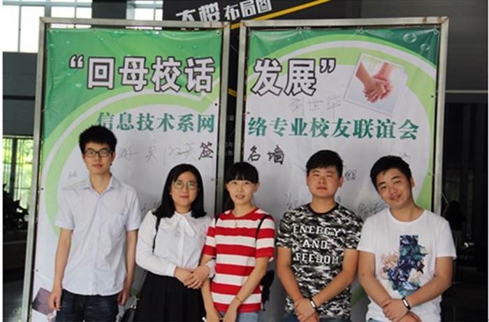 活动当天网络专业校友如约回到母校,在海报上签名并合影留恋。随后,校友们前往会议室共叙母校情谊。刘世华老师对到来的校友们表示了热烈欢迎,他希望校友们能够加强沟通联系,为母校的发展共同出力。08级校友郭全静同学代表校友发言,讲述了自己职业发展心历路程,她说到:从校园的技术优等生到踏入岗位的新手,再选择转到市场拓广岗位,每一次都是对自己的挑战。她也与在座同学分享了工作收获:做IT行业技术岗位,在掌握好技术的基础上,一定要不断加强人际交往能力,才能更好地服务于客户。10级校友向红英同学代表校友发言,并向学校提出了个人建议:希望专业考证可以选择企业实际需求的证书,校内的课程应多实践、少理论,并创造企业真实环境,让学生得到更多地锻炼。