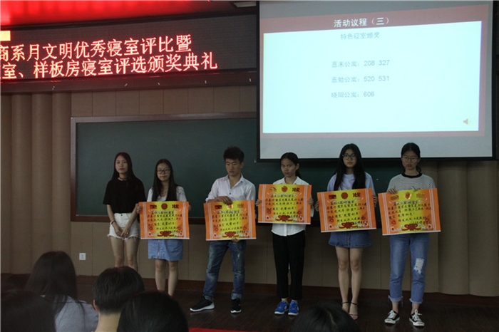 会上,陈宙老师总结了工商系4月份的寝室卫生状况,并对样板房寝室与特色寝室的评选进行介绍。同时,为月文明优秀寝室、特色寝室进行颁奖,对样板房寝室进行授旗。最后,陈宙老师希望每位学生都能营造出积极向上、舒适优雅、安全和谐的寝室文化氛围,共同推进文明寝室创建工作。(通讯员:许春雷)