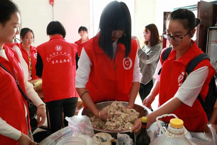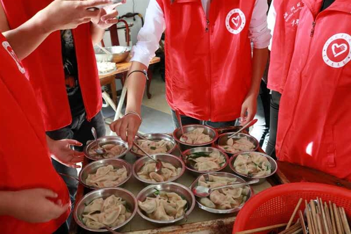 志愿者们带着“服务之心,关爱之心”来到了养老院,尽管与老人们在在语言上遇到了沟通障碍,但丝毫不减志愿者们片片爱心。在养老院负责人宝姨的帮助下,志愿者们个个动手包起了饺子,把一碗碗热腾腾的饺子端到老人们的手上。老人们脸上洋溢着灿烂的笑容,不时夸奖志愿者们手艺好,真懂事。看到老人们的笑脸,志愿者们的心里也是暖暖的。
