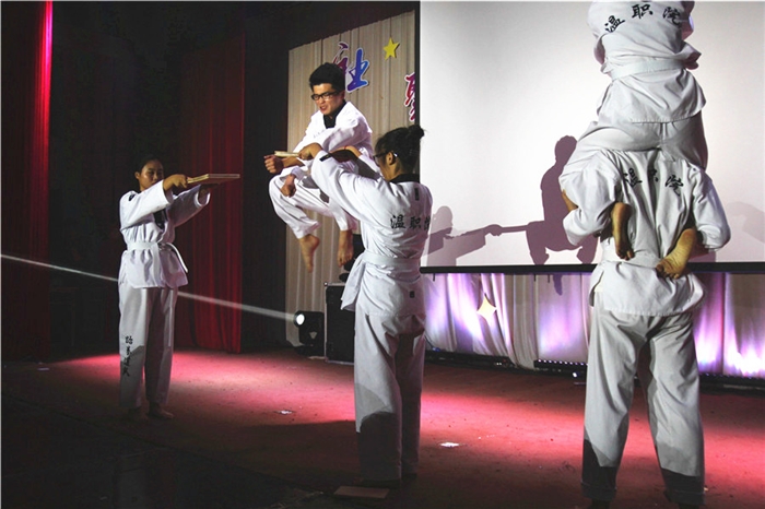 在炫丽的灯光照耀下,伴随着乐器社激情高昂的《直到世界尽头》演奏中,社团文化节开幕式拉开帷幕。青露社、爱心社通过朗诵、手语表演的方式展示了社团在环境保护、关爱弱势群体方面做的志愿服务工作,给在场的观众带来了暖暖的爱意。动漫社的同学们通过精心的人物造型、精彩的演绎带领大家走入了充满奇幻和未知的二次元世界。在聚光灯下,街舞社带来的舞蹈《街舞秀》使得场下的同学连连拍手叫好,尖叫不断。现场的抽奖环节、游戏环节把晚会的气氛一次一次带上了高潮。跆拳道社的同学们霸气十足,雪白的道服,映衬着矫健的身影,其中巾帼英雄以一对四,打败男对手,赢来现场阵阵掌声。会计社的同学们带来的喜剧小品《四大才子》,引得全场观众捧腹大笑,笑声不断。兰芷汉服社带来的师生同台汉朝服装、礼节展示,让现场观众领略了中华文化的博大精深。