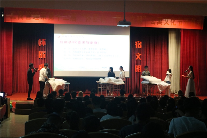 (工商系通讯员 林添添)静乃舍本,雅集舍风;谐博舍爱,传匠舍明。为丰富同学的校园文化生活,营造美好和谐的寝室氛围,11月6日晚,工商系在树人堂举行第十二届“怀匠心,宿文明”公寓文化节开幕式。