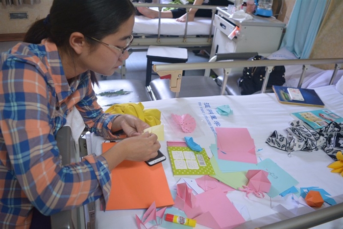 在儿童病房苏护士长的引领下,志愿者们得到了患儿家长的许可后走进病房,向孩子们表达了关怀之情,很快便与孩子们打成了一片。活动中,志愿者们认真教孩子们手工剪纸、折纸、绘画和讲童话故事。讲述童话故事。在志愿者的指导下,有些孩子制作了漂亮的作品。三个小时的志愿服务活动,带给孩子很多欢乐。