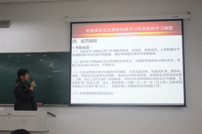 据悉,红色先锋班创立于2010年9月,主要学习对象为时尚设计系入党积极分子、预备党员、正式党员等,以红色先锋班夜间学习、芝兰传香帮扶活动、红色先锋班志愿活动等形式开展学习与实践锻炼,迄今为止已经开展13期,共计1000人次参加培训。
