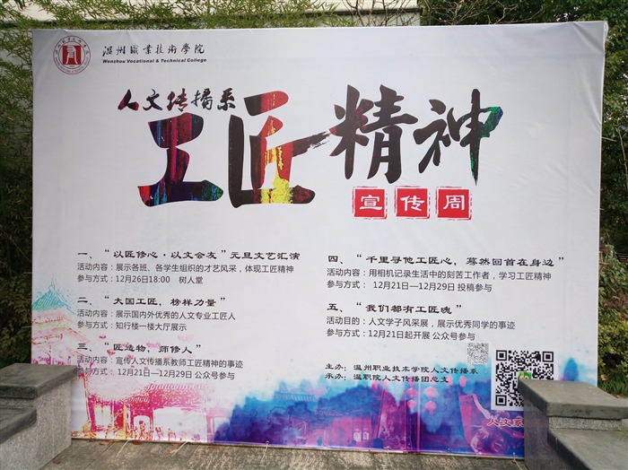 (人文系通讯员 邹倩倩、叶诚君)本学期,人文传播系围绕“工匠心·人文情”开展了系列工匠精神宣传活动。活动以学生喜闻乐见的形式宣传工匠精神,旨在激发学生的思想火花,启发学生利用兴趣、挖掘自身优势进行学习规划与职业发展。