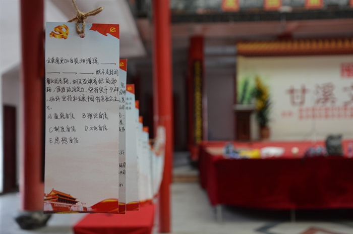 在活动现场,一张张关于十九大报告知识的书签在风中飞扬,村民们热情高涨,纷纷参与到活动中来,认真阅读书签上的题目并进行回答。对于不清楚的知识点,村民们或相互探讨、或拿出手机查看资料,活动现场气氛热烈,村民们在享受答题乐趣的同时加深了对十九大报告的理解。