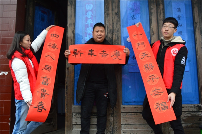 “年年顺景财源广,岁岁平安福寿”、“万马腾祥圆富梦,三阳开泰启鹏程” 、“一年好景同春到,四季财源顺水来”……一副副苍劲有力、透着浓浓年味的春联,由新青年下乡服务队志愿者书写好并送到村民的手中,让村民们感受到了温暖,“有了春联,年味儿浓了,真好”村民们对志愿者表达感谢,受到了一致好评。