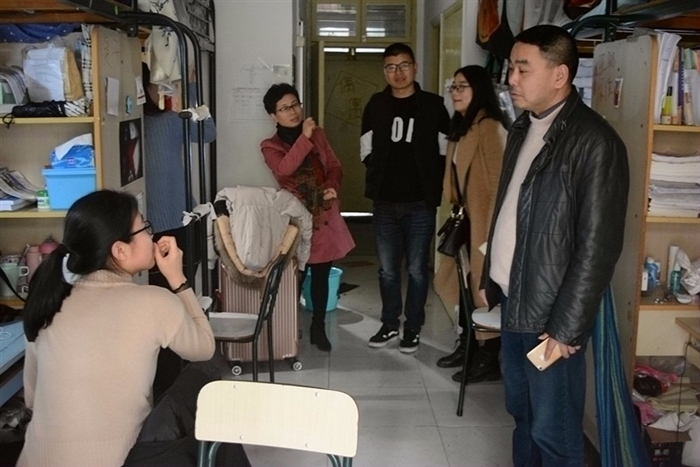 在大一女生寝室,简家进仔细询问同学们的期末考试情况和大学适应情况,鼓励同学们要克服当前遇到的难题,多请教老师和学长学姐,尽快适应大学生活。他还夸奖了同学们精心装扮的寝室,希望室友关系像寝室环境一样和谐美好。