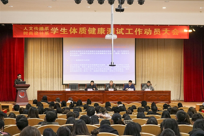 (人文系通讯员 蔡力佳) 2018年3月8日晚,人文传播系、时尚设计系学生体质测试动员大会在树人堂举行。学院公共教学部主任赵岳峰、时尚设计系党总支书记欧阳翰夫、人文传播系党总支书记郑国波、学生处副处长徐贤明、公共教学部体质测试中心主任赵显品、两系学工办主任及辅导员参加了此次会议。会议由欧阳翰夫主持。