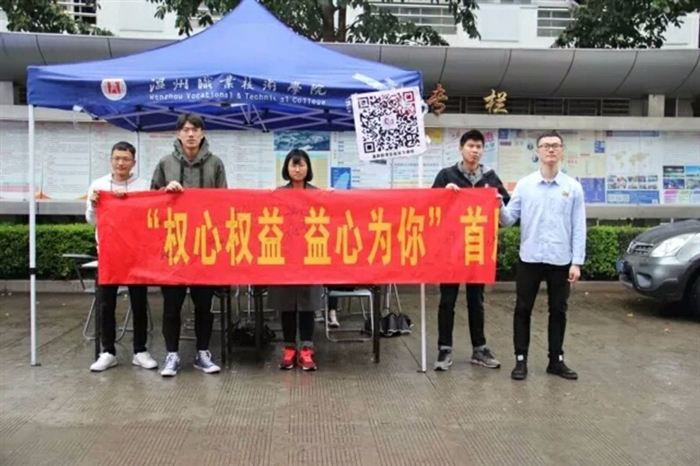 学生维权现场咨询会上,工作人员向同学们发放“维权知识”宣传单,介绍院学生会开设的线上线下投诉渠道;精心设计的“大学生维权知识竞答”引来了不少同学的热情参与。