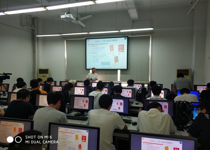 课上,赵战锋将思政元素巧妙的融入了各个教学案例中,贯穿课堂始终。在讲述UG软件时激励学生“师夷长技以制夷”,用好国外软件UG,将中国制造做强做大;在进行光栅图片导入和渲染教学时,采用“华为手机标识创建”案例,自然而然的穿插“中美贸易战”的话题,从华为海思做成高端“中国芯”谈起,引导学生热爱中国造产品,体会“中华有为”;在三维曲线曲面综合应用教学中,赵战锋以党校标识牌、党徽制作为案例,强调要精心绘图,一丝不苟,以工匠之心,铸制造强国。