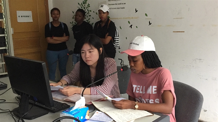 在人文系商务英语专业彭茜茜老师的精心挑选与指导下,三名南非留学生Emily、Lerato、Palesa与台里的三位“资深”播音员郑艳玲、王若蕾、徐小凤进行搭档,在每周周三12:00-12:25 午间档播出英语广播节目。