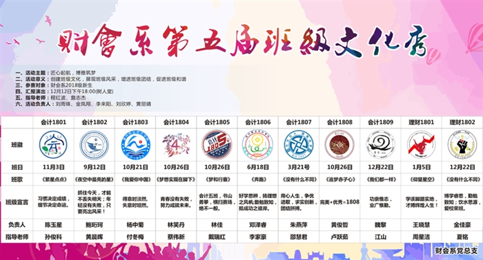 财会系第五届班级文化秀由文本制作、现场投票、网络投票、汇报演出四个阶段。在为期一个半月的筹备中,班主任亲自指导、班委全权负责、全体学生积极参与,有效创建了班级文化、展现了班级风采、凝聚了班级力量、促进了班级和谐。