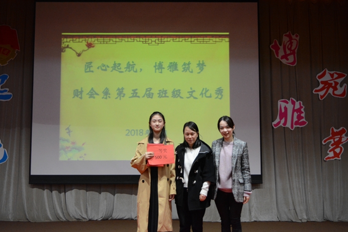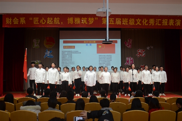12月12日晚,财会系500余名师生齐聚树人堂,观看财会系“匠心起航、博雅筑梦”第五届班级文化系汇演,2018级11个班级围绕班日、班徽、班歌、班规、班级公益项目等八个方面展现班级文化。财会系党总支书记吴冰、副主任王赛芝、全体新生班主任及辅导员出席了汇演。