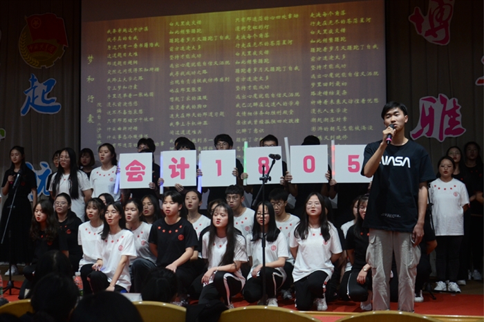 吴冰在致辞中讲到,班级文化秀是财会系为新生班级准备的一份厚礼,借此展现新生的靓丽风采。同学们初入大学,在班主任的带领下齐心协力设计班徽、确定班日、筛选班歌,凸显了班级特色,凝聚了班级力量,展现了班级风采,希望同学们未来三年一切美好。随后,各班代表通过PPT详细解读了班日、班徽、班歌等八个内容的创造灵感和深刻意义并集体登台演唱了班歌。精彩的解读和嘹亮的歌声,点燃了观众们的激情,也点燃了当晚的校园。