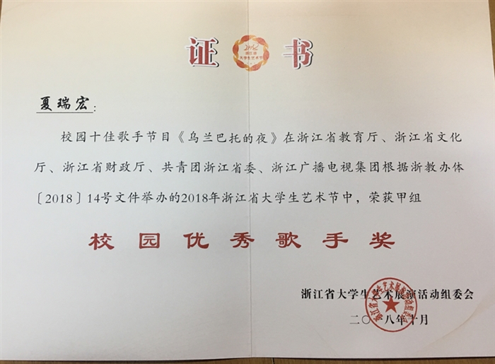 在此次大学生艺术节上,由我院大学生艺术团选送的合唱作品《父亲的散文诗》荣获浙江省大学生艺术节声乐类节目甲组二等奖;夏瑞宏和刘怡玥两位同学,分别以拿手作品《乌兰巴托的夜》和《错的人》,荣获浙江省大学生艺术节甲组“校园优秀歌手奖”。