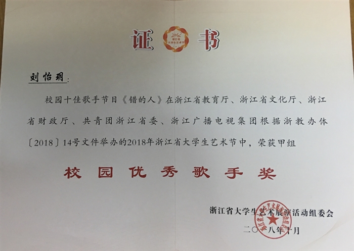 (团委通讯员 吴剑)由浙江省教育厅、浙江省文化厅、浙江省财政厅、共青团浙江省委、浙江广播电视集团主办的2018年浙江省大学生艺术节于2018年10月圆满落下帷幕。我院学生推荐作品荣获声乐类节目甲组二等奖,两名学生获“校园优秀歌手奖”。