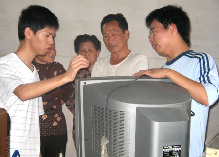 在慰问团进行活动的同时,随团开展家电维修的青年志愿者在罗山村里也摆开了“架势”,为罗山村民们免费维修家电。大大小小的家电没出多少时间堆在“维修员”的面前。尽管不间歇地维修累得满头大汗,但同学们没人喊累叫苦,赢得了村民的赞扬。看着村民们脸上满意的笑容,同学们心中感到了一丝丝的欣慰。