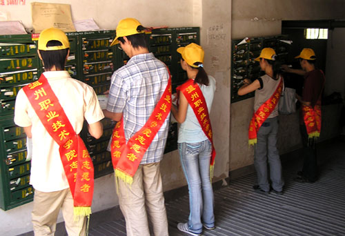 我院青年志愿者头戴统一分发的标有“青年志愿者”黄色帽子,身批红色绶带,穿梭在江滨街道的十八家、南亚、黎明新村社区,形成了一道靓丽的风景线。他们挨家挨户分发宣传“文明温州”的传单,使更多的社区居民加入到“创建文明城市”的行列。