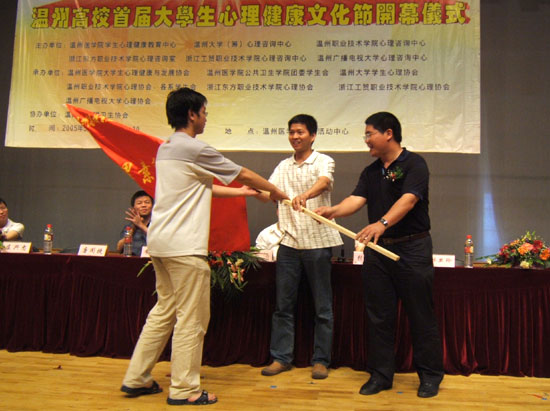 6月9日,首届高校心理健康文化节闭幕式暨心理素质拓展营颁奖仪式在温州医学院落幕。在闭幕式上,东道主“温州医学院”还别出心裁组织了由温州大学(筹)、温州广播电视大学等六个高校的心理素质拓展营参加的营队心理游戏比赛。我院派出了由12名心理素质拓展营营员组成的“可乐队”在比赛中荣获“季军”。