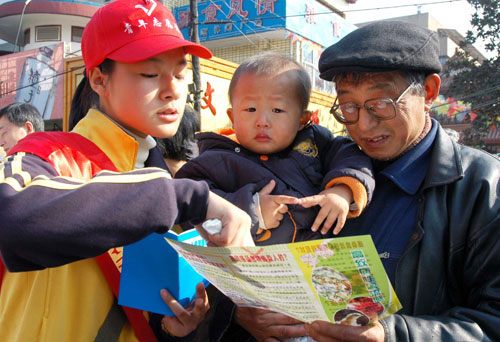 11月30日,我院大学生青年志愿者走进市区肖箕涂社区向市民发放科学防治禽流感材料。60余名大学生青年志愿者在社区中一字排开,在社区主要路口摆放了禽流感防治的防治宣传画和横幅,向过路的市民发放预防禽流感宣传单。