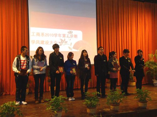大会首先由辅导员林祯乐老师就工商系“2010学年第二学期学生活动计划和学风建设工作安排”做了报告。报告指出,本学期工商系学生工作将围绕学院工作要点,以学生就业为导向,以“三早一晚”为重点,“一月一主题,一周一重点”,切实加强学生思想教育,完善管理工作。随后,工商系学生代表分别上台对上学期的工作和活动做出了精彩总结,并对新学期各项工作和活动进行了展望。大会还对2010年获得国家奖学金、励志奖学金的同学以及在上学期学风建设工作中表现突出的学风示范班级、“三早一晚”优秀学生讲师等集体和个人进行了隆重表彰。之后,工商系在院“十佳百优”活动中获得荣誉的10位同学上台进行了事迹汇报。