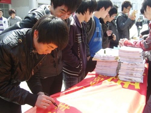 3月23日上午12时,面向全校的大型募捐活动正式开始。同学们纷纷捐款,为贫困灾区的孩子献出自己的一片爱心,短短三个小时内,就有数百名同学踊跃参与,临时捐款地点更是出现拥挤的现象。