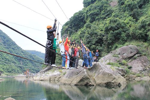 本次活动地点是在风景秀丽的九鲤溪峡谷运动乐园,在长约2公里的峡谷里设有携手并进、高空溜索、凌空漫步等十多个激发个人潜能、锤炼意志品质、熔炼团队精神的经典户外运动体验项目。
