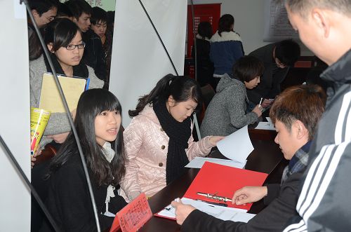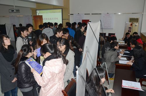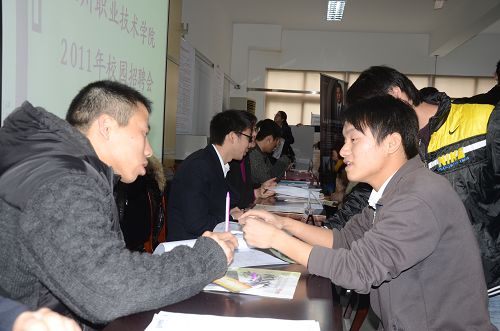 12月28日下午,我院在行政楼招聘大厅举行2012届毕业生校园推荐会。推荐会上,浙江乔顿服饰、温州天瑞房开、温州开通拍卖公司等15家单位提供了356个高质量岗位。这些岗位转正后月工资均在2500元左右,享有五险或五险一金。有的单位还实行双休八小时工作制,并提供食宿补贴。推荐会现场人声鼎沸,毕业生们一边浏览企业海报,一边认真比较各家单位的岗位和待遇,有的则直接坐在招聘摊位前,递交简历、咨询问题和索要名片。参会单位对我院毕业生应聘表现均感到满意,在简历收取中也多有斩获。一家拍卖公司短时间内就收到简历20多份,吸引毕业生的是他们转正月工资为3500-5000元,双休加五险。