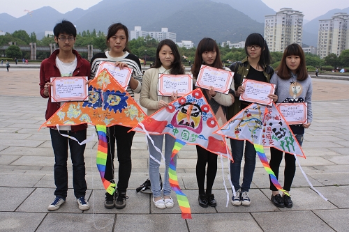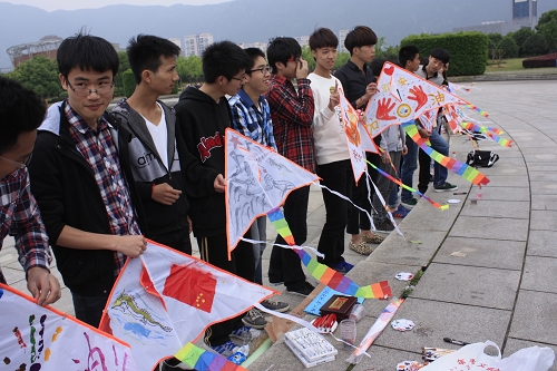据悉,此次活动分为两大环节。第一个环节:由选手们自由组队,两人一队,40分钟内在主办发所提供的空白三角风筝上设计风筝图案,此环节有90分。第二环节:选手们放飞他们的风筝,此环节有10分。在制作现场,选手们分工合作,有的绑骨架,有的绘画,然后一起放飞。选手们都表现出极大的热情和极高的兴致。热闹的气氛引来了众多的路人,他们驻足观赏,不时指点一二,与选手们共同分享放风筝的轻松和喜悦。天空中样式各异、特色鲜明的风筝,承载着同学们的“中国梦”,成为学子广场上一道特别亮丽的风景。最值得一提的是,在此次活动中许多同学在风筝上写着对四川雅安的祝福,展示了当代大学生关注社会,关怀同胞的良好风貌。