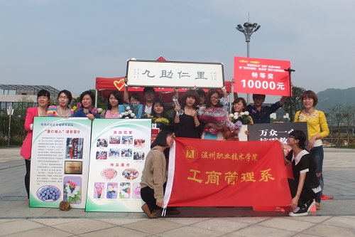 4月26日,温州职业技术学院工商管理系“匠心花艺”项目与梧梴社区“幸福青年家园”志愿者活动站结对共建的“里仁助人”公益项目,在瓯海区纪念“五四”运动94周年暨“我的中国梦•.瓯海梦”青年社团创意汇活动中荣获特等奖,项目项目奖金1万元。工商系的志愿者队伍由辅导员林景老师带队,由50余名的队员以及纸花、丝纺花俱乐部讲师和优秀学员组成。