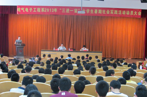 为积极响应关于组织开展2013年学院“三进一留”大学生暑期社会实践活动的通知,5月24日中午,电气电子工程系在信息楼报告厅隆重召开2013年大学生暑期社会实践活动动员大会暨安全文明教育。系党总支书记晁拥军、系副主任章丽芙,大二全体学生,大一各班班委共500余人参加本次大会。