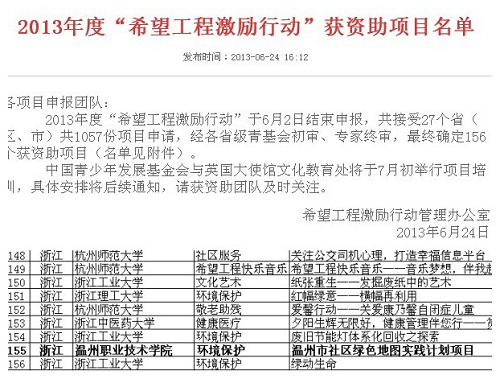 近日,中国青少年发展基金会与英国大使馆文化教育处联合主办的2013年中国“希望工程激励行动”资助项目公布,建筑工程系“温州市社区绿色地图”项目获得入围。据悉,本次激励行动共接受全国27个省(区、市)共1057份项目申请,经各省级青基会初审、专家终审,最终确定156个获资助项目。温州项目第一次入围该行动,全国仅两家高职院校入围。
