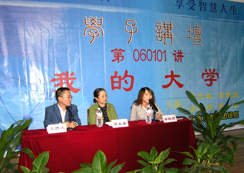 工商系党总支策划的《学子讲坛》开讲了。11月23日晚,讲坛的第一讲被命名为《我的大学》。讲坛刚刚起幕,就带给现场观众一个意外的惊奇,对《学子讲坛》充满了期待。一位在校大学生竟然登上了大学的讲坛,对着众多学弟学妹们讲述自己即将结束的大学生活,与她同台开坛设讲的是又一位老大学生、副教授——苏北春老师。一老一小,从各个时代的角度讲述了不一样的大学生活,言语中也引发了听众们对大学生活许多思索和探讨。