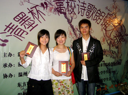 5月26日,由温州市学生团体联合会主办的温州市首届“清墨杯”诗歌朗诵大赛在温州书城落下了帷幕。经过激烈角逐,我院工商系仇洁同学以一曲徐志摩大师的《雪花的快乐》夺得了比赛二等奖,财会系徐佩佩同学、计算机系温云乐同学同获三等奖。