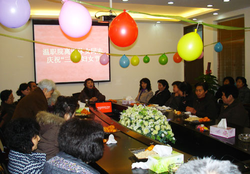 组织部副部长、离退休管理处长钱芳到会祝贺。她代表学院向离退休女同志致以节日的问候,并祝福女教工们都能健康生活;离退休协会会长叶治经还代表男教工们为退休的女教工们即兴朗诵诗歌,助兴“三八”节。