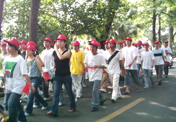 6月27日,我院电气系组织了40多名学生来到了九山体育馆,与温州百万名中老年人参加了以“全民健身、利国利民、功在当代、利在千秋”为主题的温州全民健身月启动仪式暨“百万老年人健身走”活动。活动中还穿插了迎奥运签名活动。许多同学把自己的祝福透露于字里行间,希望中国代表团能够在2004雅典奥运会中扬眉吐气,取得辉煌战绩。