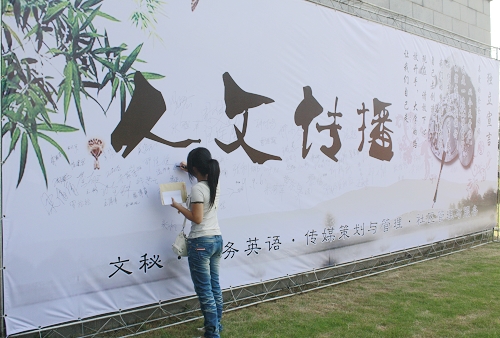 在火热进行的迎新工作中,设在人文系迎新点的大幅喷绘吸引了众多目光。“从今天开始,我们就是一名大学生了。我们有自己的青春,我们的梦想由我们自己来创造。请放下心,放开手,大学的路让我自己走”。这是为2009级人文传播系400多名新生开辟的独具特色的 “新生独立宣言”墙,新生们纷纷在喷绘上郑重签名,向呵护自己的父母表达自己独立自主的信心与决心。文秘0901班的新生潘双双说:“在家里我们很依赖父母亲,现在考上大学,我们要独立,最起码的是自己的事情自己做,今天的报道手续我都是一个人独立完成的。”90后们的“独立宣言”,充分突显了新生们独立自主的意识,相信他们将凭借年轻人的坚强、执着、不屈的精神面对未知的大学生活,学会放开父母的手,学会自我解决问题,学会梳理人际交往,学会规划自己的未来,开拓属于自己精彩纷呈的人生。