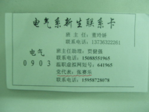 经过严格的考核与筛选,电气系自动化0703施成芬、电器0702张晓雷、电子0702潘林丽、计控0701黄帆等十位同学幸运地成为第一批新生班级的“党代表”。9月6日白天,在如火如荼的迎新活动中,可以看到他们挥汗如雨的身影;9月6日晚上,他们不辞辛劳参与新生班级第一次主题班会,特别介绍党团知识、新中国的建设历程、我系学生党员发展的基本程序与活动特色;9月7日晚上,他们随同辅导员老师及新生班主任助理,一同走访新生寝室,看望叮嘱新生,特别吩咐H1N1防控措施与汇报制度;9月8日晚上,他们激情昂扬引领新生班级同学,排练歌唱党与祖国的革命歌曲,为即将到来的“新生红歌会”做充分准备。