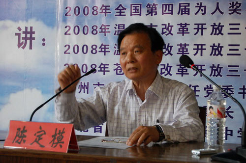 会上,陈定模向同学们介绍了龙港的成功经验:1984年建镇之初龙港还是一个荒芜的小渔村,作为龙港镇的党委书记,陈定模发扬温州人敢为天下先的精神,他大胆实行户籍改革,创造性地进行土地有偿使用的实践,进行人口梯度转移,聚集人才和资金,成功走出了一条农村城镇化的路子,成为中国农民自费建城的样板。正是陈定模的大胆创新,改变了龙港的命运。陈定模回忆当年改革创新的动力:“动力就是一切为了人民群众谋利益。要敢于解放思想,勇于实践!”
